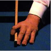 | Es gibt viele Arten das Queue zu halten. Wichtig ist jedoch darauf zu achten, dass das Queue eine stabile Führung hat. Zudem sollte der Bock während dem ganzen Stoss auf dem Tisch liegen bleiben – zu frühes Wegreissen der Hand ist vielfach die Ursache für ein ungenaues Spiel |
