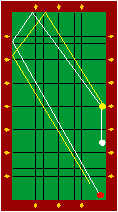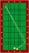 Der Spielball wird mit maximalem Linkseffet ohne Tusch auf die lange Bande gespielt. Wichtig ist, dass sich der 1. Bandenberührungspunkt des Spielballes und des Balles 2 nicht decken.